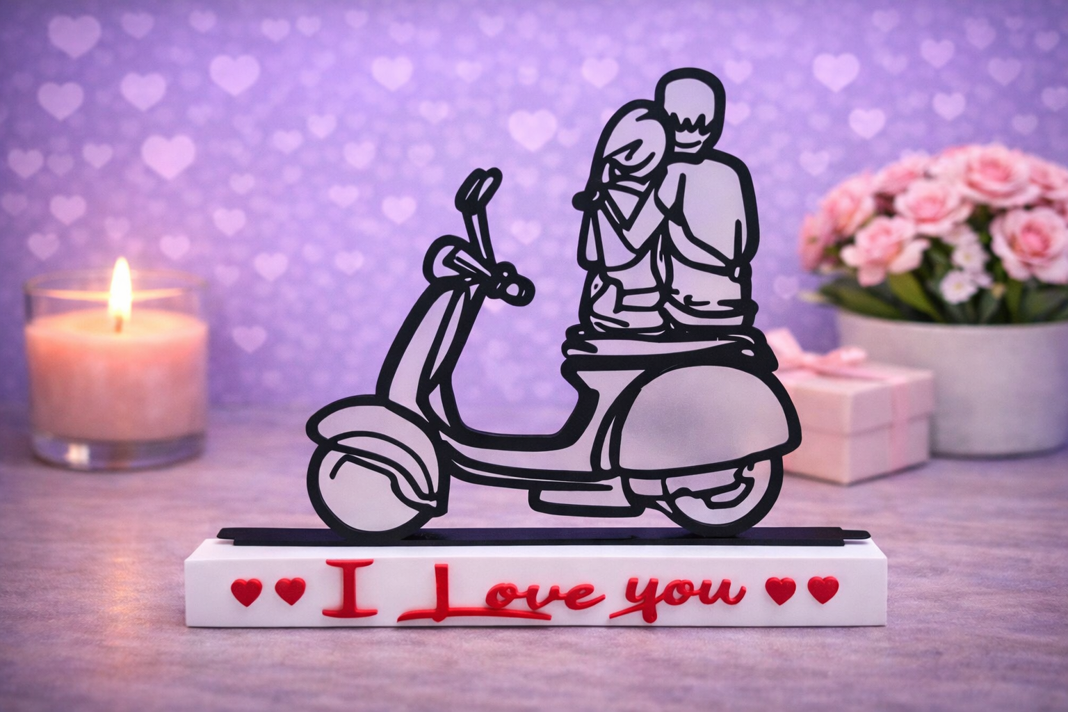 تصميم أنيق على شكل سكوتر مع ثنائي عاشقين بستايل خطوط فنيّة (Line Art)، مع قاعدة مميزة مكتوب عليها I Love You وقلوب صغيرة بتعطيه لمسة حب ناعمة.