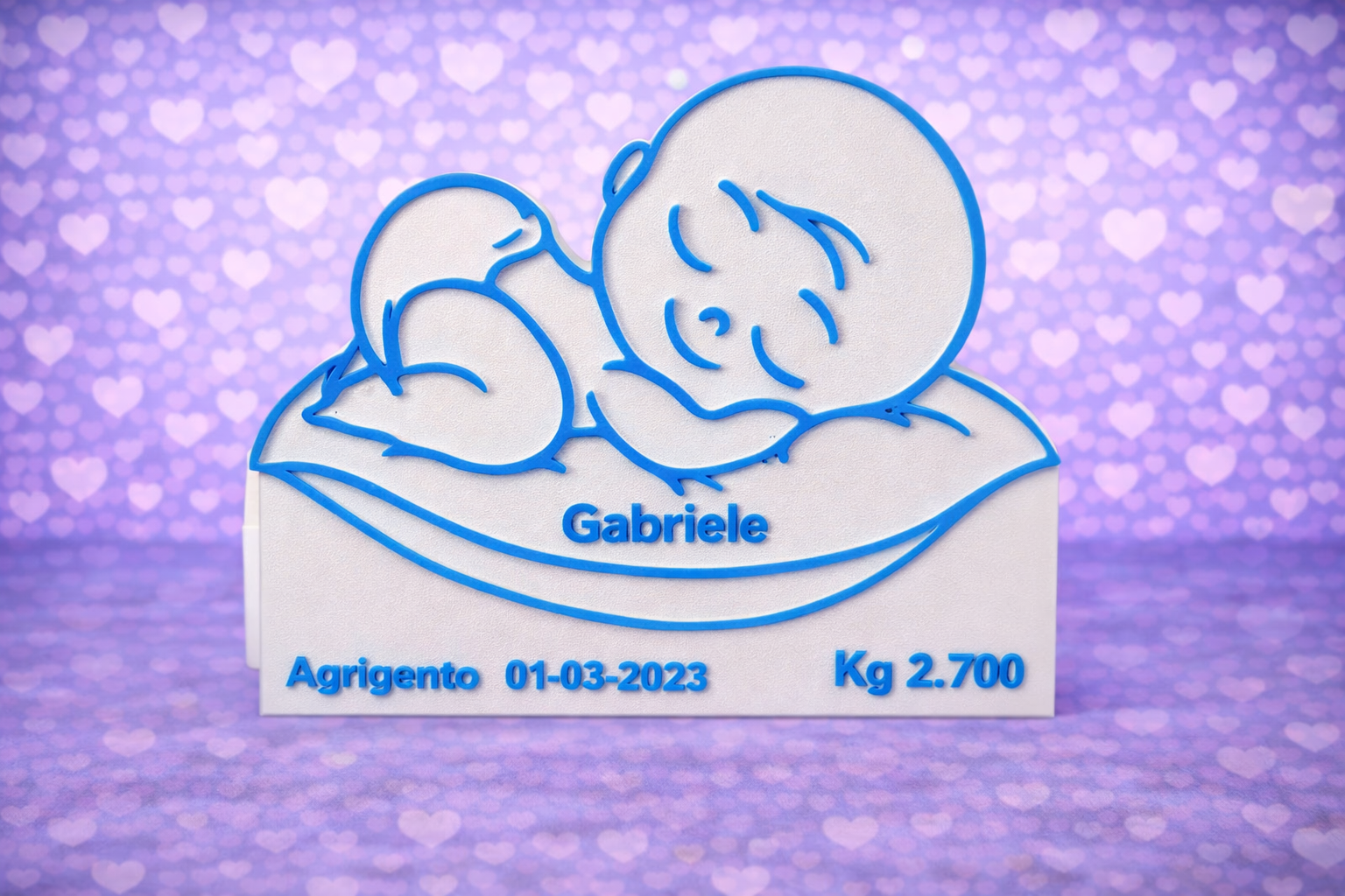 ستاند لطيف بتصميم طفل نائم مع قلب، مع إمكانية إضافة اسم المولود + تاريخ الميلاد + مكان الولادة + الوزن. هدية مثالية للمولود الجديد وتبقى ذكرى جميلة للأهل.